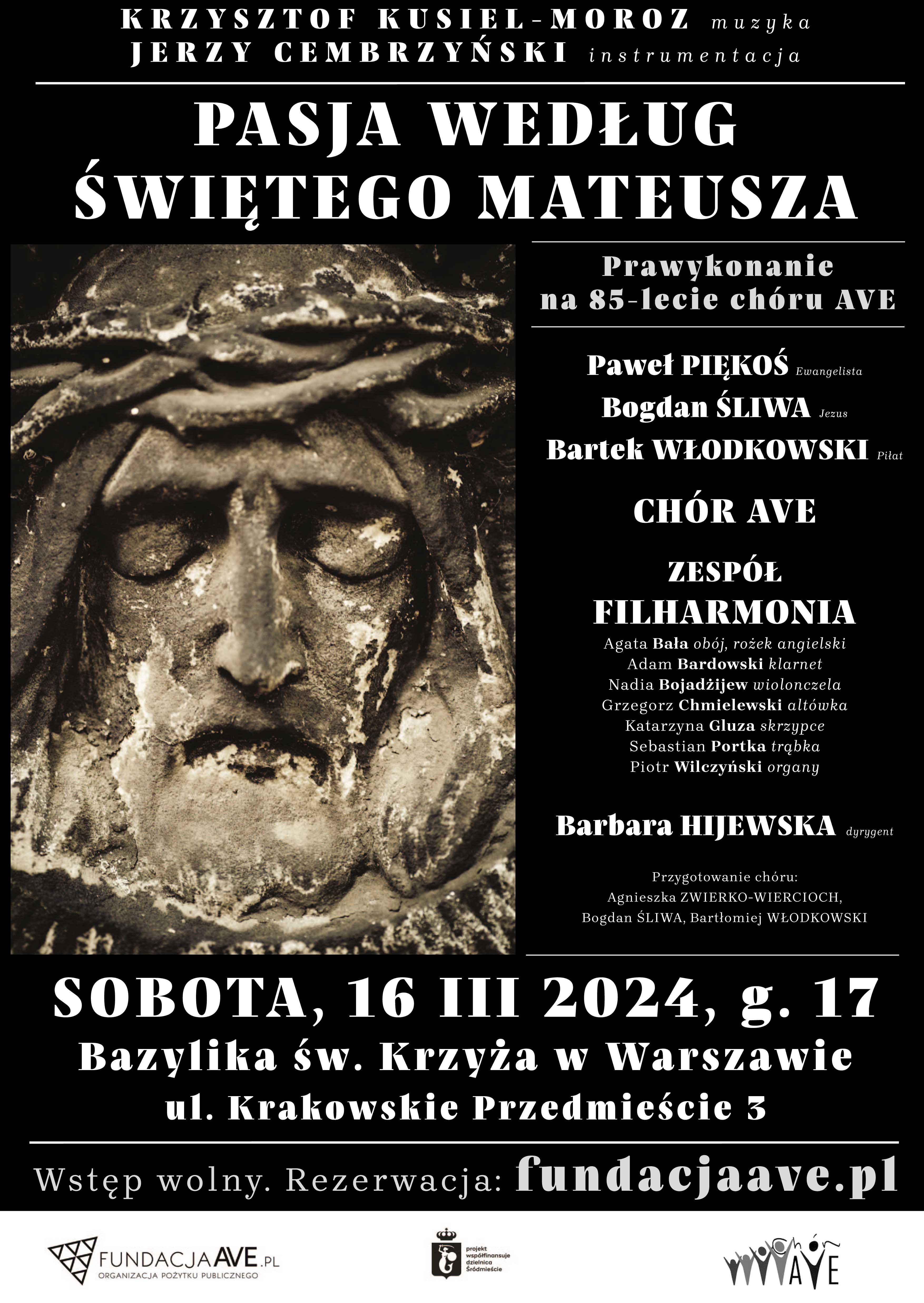 W sobotę 16 marca 2024 roku o g. 17 w Bazylice Świętego Krzyża w Warszawie odbędzie się prawykonanie „Pasji według świętego Mateusza” na głosy solowe, chór i 7 instrumentów, napisanej przez wybitnego współczesnego muzyka prof. Krzysztofa Kusiel-Moroza. Instrumentacji utworu podjął się Jerzy Cembrzyński, laureat Grammy. Wystąpią znakomici soliści, chór AVE oraz muzycy Filharmonii Narodowej.